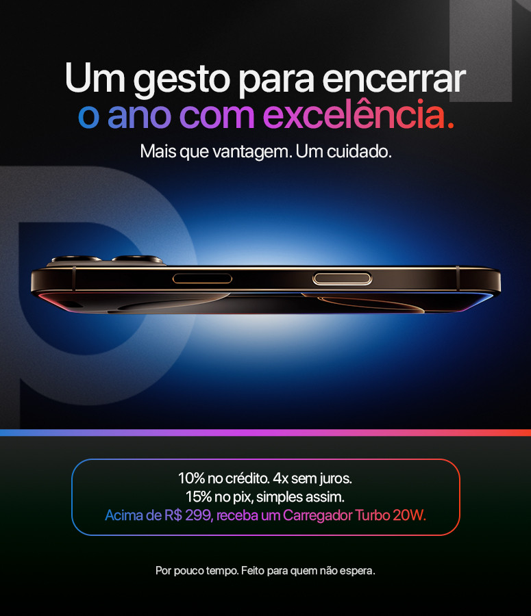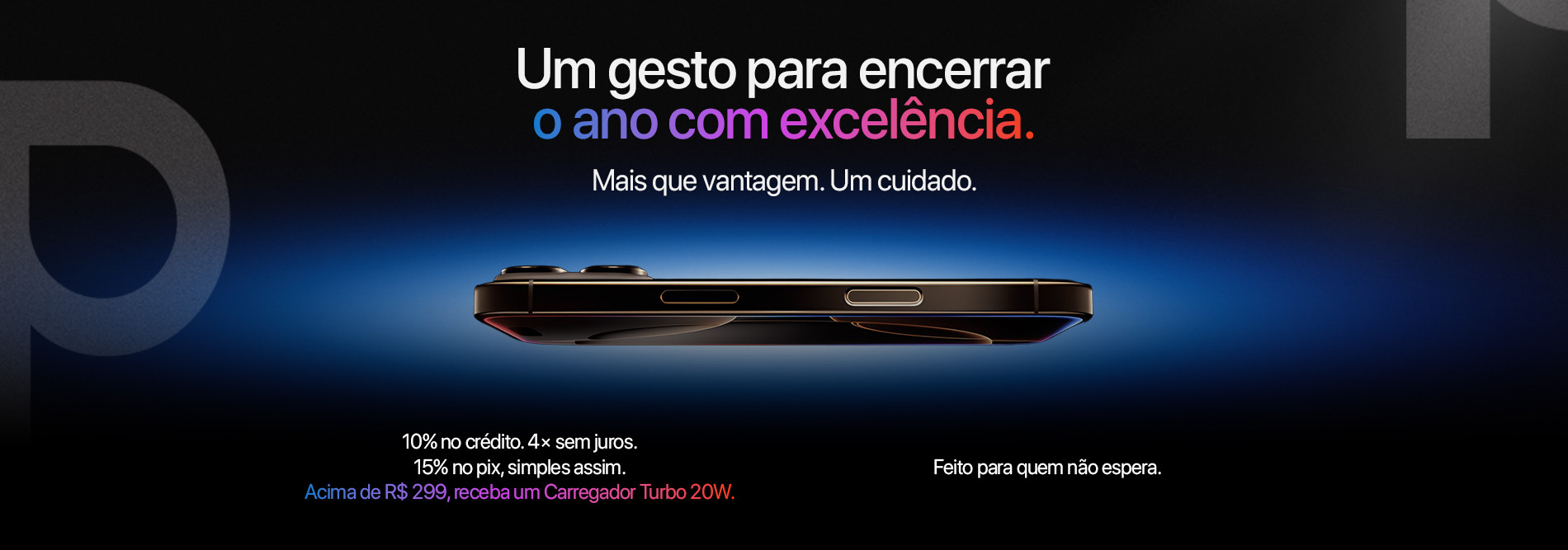 Crédito com 10%, pix com 15% e Carregador Turbo 20W em pedidos acima de R$299. Feito para quem não espera.